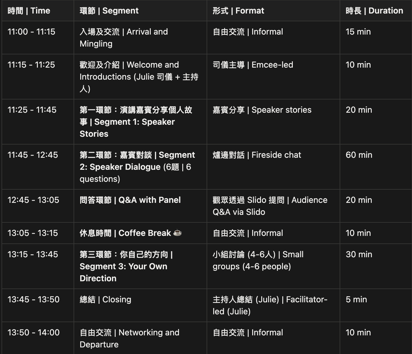 嘉賓故事分享 → 職場對談 → 觀眾問答 → 小組探索