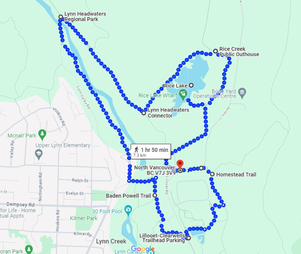 由起點 Rice Lake Gate Washroom 出發,沿 Seymour Valley Trailway 去 Rice Lake Wharf。環湖欣賞風景後,我哋會沿河行Lynn Headwaters Connector 接 Lynn Valley Rd再折返起點。